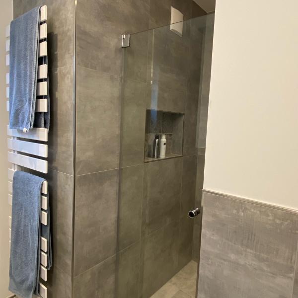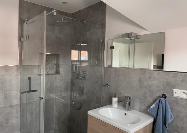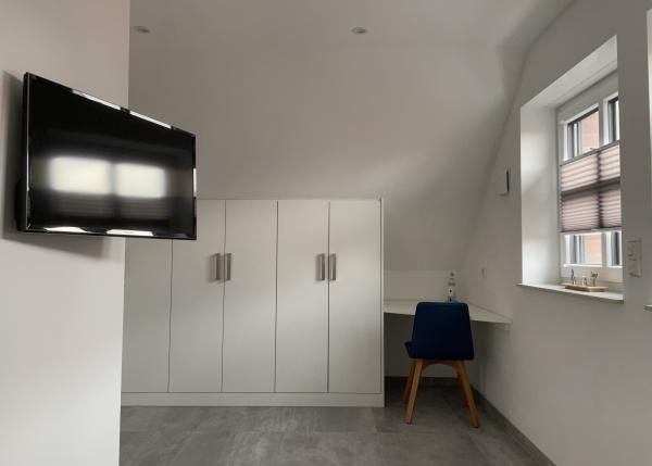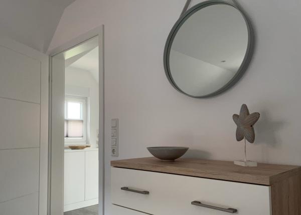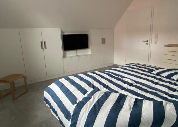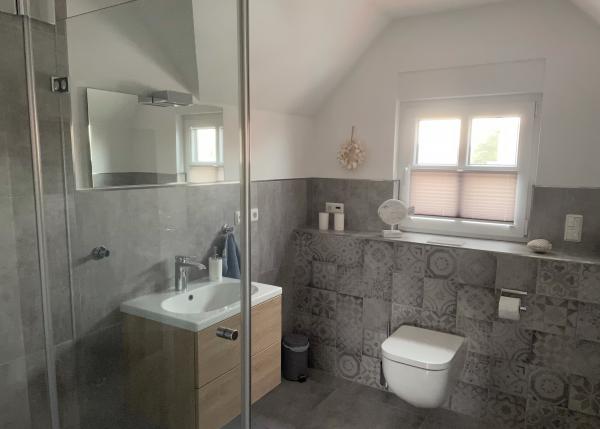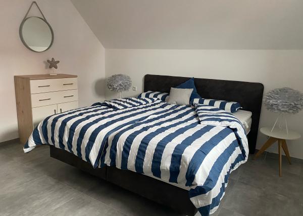 Eine Treppe aufwärts wird es keineswegs ungemütlicher! Hier befindet sich ein weiteres Schlafzimmer mit großem Boxspringbett und ein zweites, geräumiges und komfortables Badezimmer mit Dusche. Ein weiterer, kleiner Raum verfügt über ein kleines Schlafsofa für Kinder/Jugendliche – übrigens auch mit Boxspring-Technologie! Außerdem ist hier ein kleiner, aber gut nutzbarer Schreibtisch vorhanden. Beide Zimmer verfügen über Smart-TV. Wie auch im Erdgeschoss kann man hier überall prima entspannen, es ist ruhig und Dank Fliegengittern nerven auch keine ungebetenen Gäste.