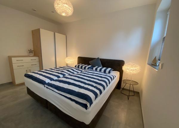 Das geräumige Schlafzimmer im Erdgeschoss verfügt über ein großes Boxspring-Doppelbett und bildet mit dem Badezimmer zusammen gewissermaßen eine kleine „Wellness-Oase“.